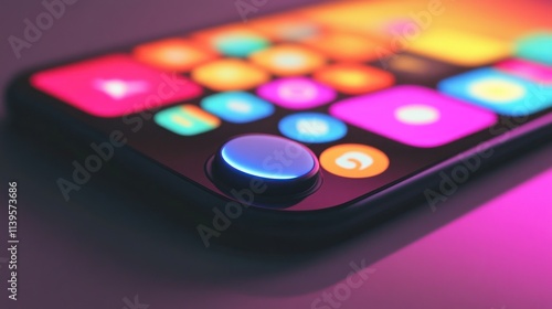 Close-up of a futuristic smartphone with colorful app icons and a glowing circular button.