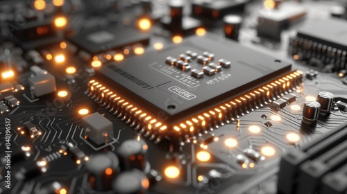 Closeup of a glowing computer microchip on circuit board, showing advanced technology in electronic