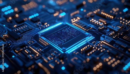 Close-up of a glowing microchip on a circuit board with blue lighting.
