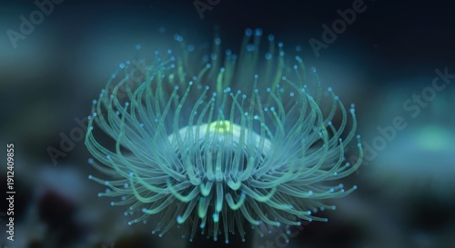 Close-up of a Glowing Sea Anemone in Dark Water.