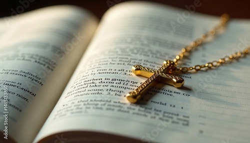 Close-up of a gold cross necklace resting on an open bible, soft light , belief, old testament