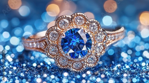 Close-up of a gold ring with a large, blue gemstone, surrounded by smaller diamonds, resting on a bed of blue glitter. Bokeh effect in the background