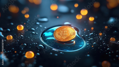 Close-up of a golden coin resting in water, colorful bokeh effects in the background.