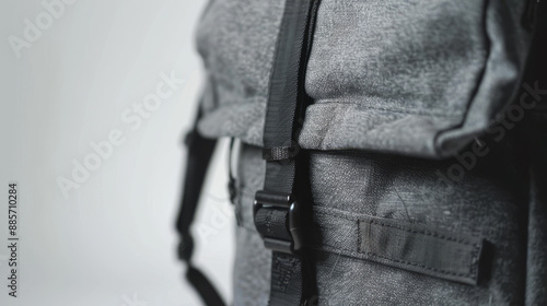 "Closeup of a gray backpack rotating on a white background."