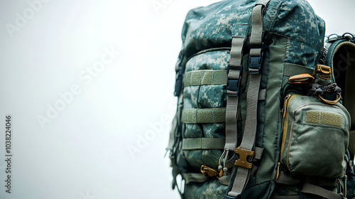 Closeup of a green and brown camouflage backpack with straps and buckles against a white background.