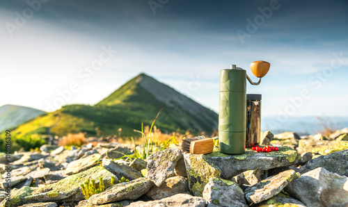 Close-up of a green coffee grinder against the backdrop of a majestic mountain peak. Outdoor adventure, enjoying coffee in nature