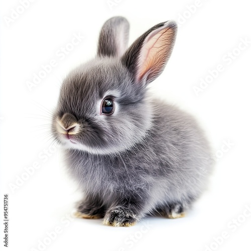 Close-up of a grey bunny with fluffy fur and long ears against a white background.