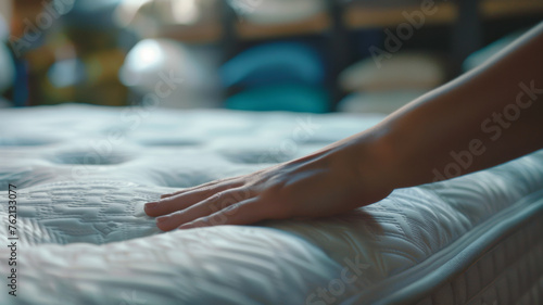 Close-up of a hand gently testing the comfort of a luxurious mattress.