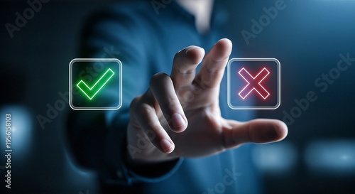 Close-up of a hand interacting with glowing choice icons. High-tech, decision-making theme.