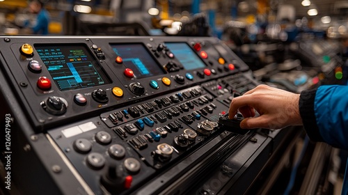 Close-up of a hand operating machinery controls in a busy industrial setting