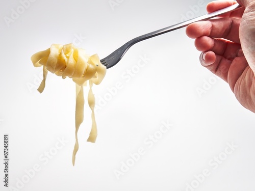 Close-up of a hand twirling fettuccine pasta on a fork against a white background, suggesting a meal.