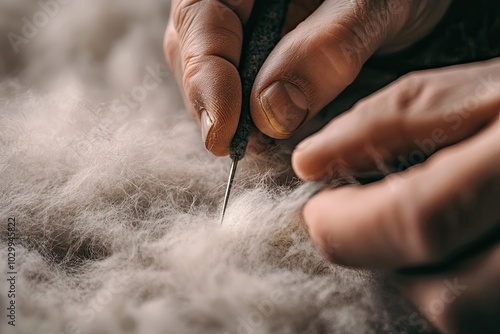 Close-up of a hand using a needle to work with white wool fibers
