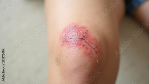 Close-up of a healing wound above the knee showing intricate skin repair