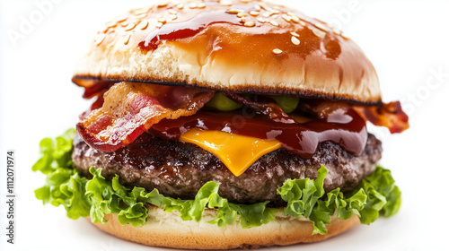 Close-up of a juicy bacon cheeseburger with lettuce, cheddar cheese, and barbecue sauce on a fresh bun. Fries and ketchup are visible in the background. Perfect for food and dining themes