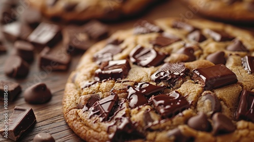 Close-up of a large chocolate chip cookie with melted chocolate on top and chocolate chips scattered around on a wooden table.