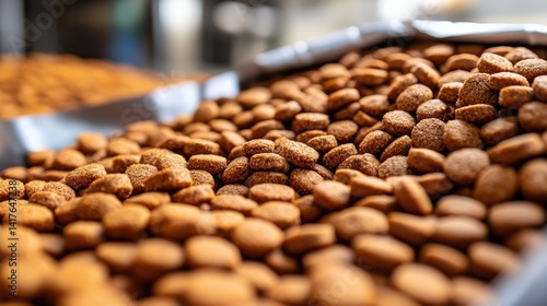 Close-up of a large pile of brown pet food kibble in a commercial kitchen setting