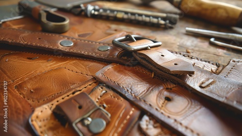 Close-up of a leather bag with a metal buckle. The bag is made of brown leather and has a distressed look. There are some tools on the background.