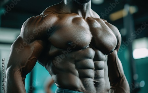 Close-up of a male fitness model's torso, revealing ripped six-pack abs, toned shoulders, and chest, highlighting muscular definition and strength, perfect for workout branding