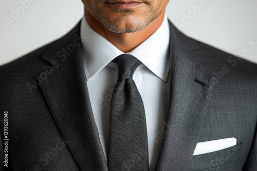 Close-up of a man in a dark suit and crisp white shirt, showcasing professional attire