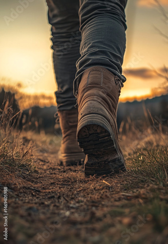 Close-up of a man's boots walking on a path in a field. A low-angle shot in golden-hour lighting