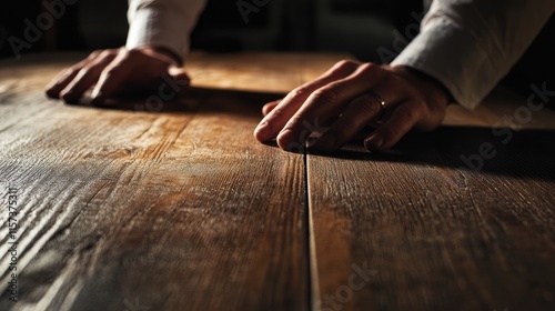 Close-up of a man's hands resting on a rustic wooden table in a dimly lit living room setting with laptop in the background.