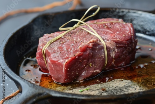 Close-Up of a Marbled Steak in a Cast Iron Pan