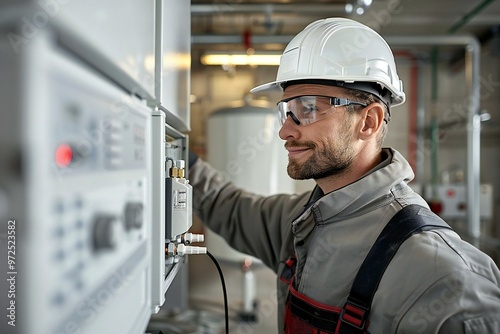 Close-up of a mid-adult male plumber confidently installing a water heater in a modern kitchen. The scene showcases his expertise in electric and plumbing services.