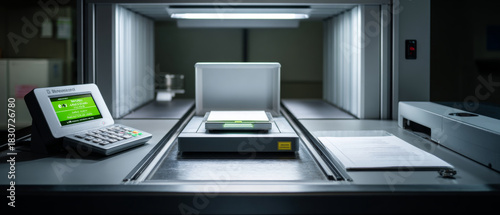 Close-up of a modern automated document scanner with digital display and paper on conveyor belt in a controlled environment