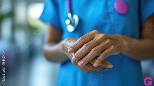 Close-up of a nurse's hands applying lotion, showing care and hygiene.