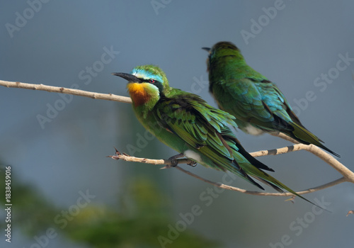 Closeup of a pair of Blue-cheeked bee-eater perched on twig