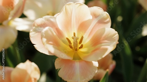 Close-up of a pale peach tulip with soft petals and yellow center, surrounded by green foliage in a garden setting.