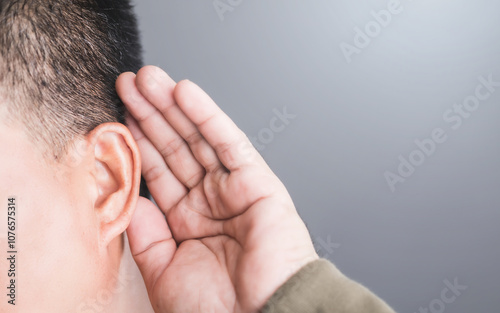 Close-up of a person cupping their hand behind their ear, indicating hearing difficulties. This image highlights the challenges of hearing loss and the importance of ear health awareness