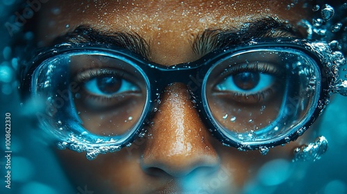 Close-up of a person's eyes underwater, wearing goggles, with air bubbles.