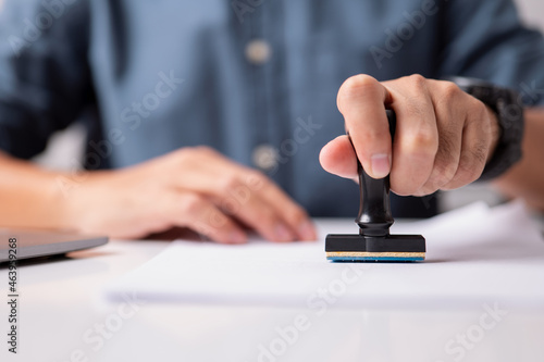 Close-up of a person's hand stamping on an approved application form