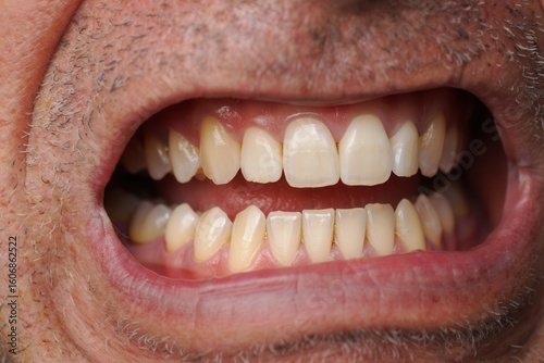 Close-Up of a Person's Mouth Displaying Teeth, Highlighting Oral Health and Hygiene with Emphasis on Color and Condition of Enamel and Gums