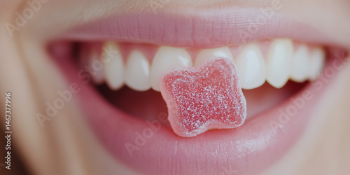 Close-up of a person's mouth with white teeth and a red, square-shaped candy pressed against their front teeth. The candy is covered in a sugary coating.
