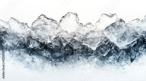 Close-up of a pile of translucent ice cubes on white background.
