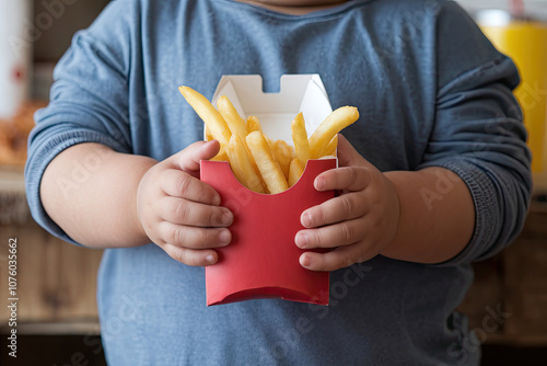 Close-up of a plus-size child’s hands holding a box of fries