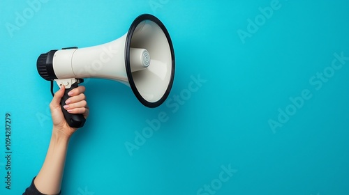 Close-up of a portable megaphone held still, tilted slightly to the side, leaving space for text, on a solid color background.
