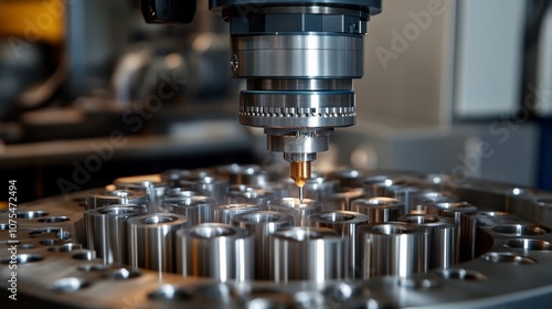 Close-up of a Precision Drilling Machine with a Sharp Drill Bit Poised Above a Metal Plate with Multiple Holes
