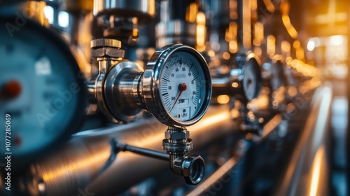 Close-up of a Pressure Gauge on Industrial Piping System