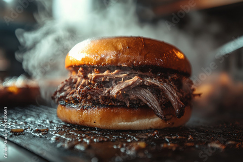Close-up of a pulled beef sandwich with melted cheese and BBQ sauce dripping, served on a toasted bun.