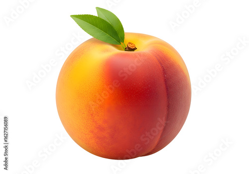Close-up of a ripe peach with a leaf.