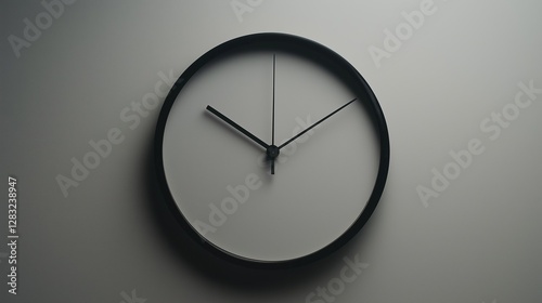 Close-up of a round clock face with a black frame. the clock face is white with black hands and numbers. the hands are pointing to the hour and minute hands, indicating that the clock is 12 o'clock.