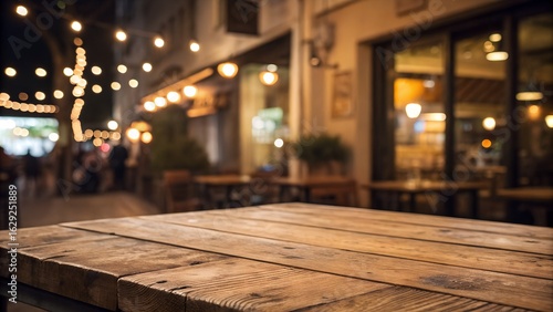 Closeup of a rustic wooden table surface in front of a blurred outdoor cafe at night with warm bokeh lights
