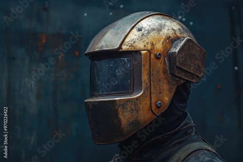 Close-up of a Rusty Welder's Helmet with a Dark Background