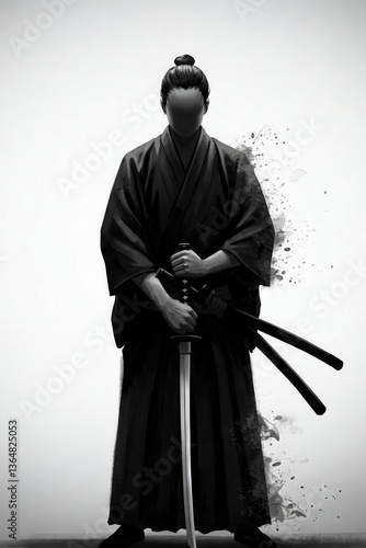 Close-up of a samurai in black robes against a stark white background. Minimalist and powerful.