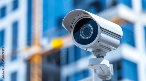 Close-up of a security camera against a blurred urban construction background.