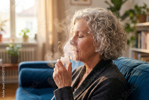 Close-up of a senior woman using a nebulizer mask for respiratory treatment at home. Steam indicates medication delivery for breathing issues