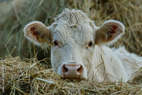 Closeup of a serene white cow lying in front of a haystack, with a detailed focus on its gentle eyes